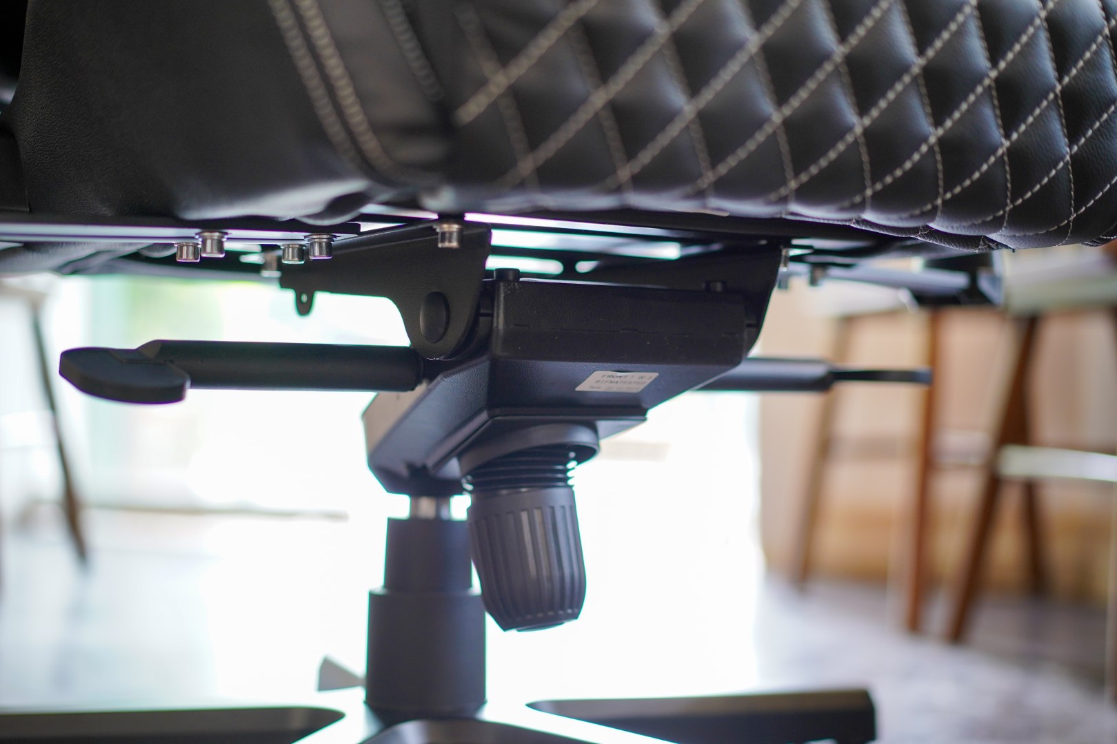 Phía dưới đây các bạn có thể thấy đỡ cho phần đệm ngồi là bệ đỡ dạng con ếch với khả năng ngả 15 độ ra phía sau và khóa góc ngả, đây là một tính năng vô cùng thú vị vì nó khiến cho bộ đôi này có nhiều góc ngồi hơn.